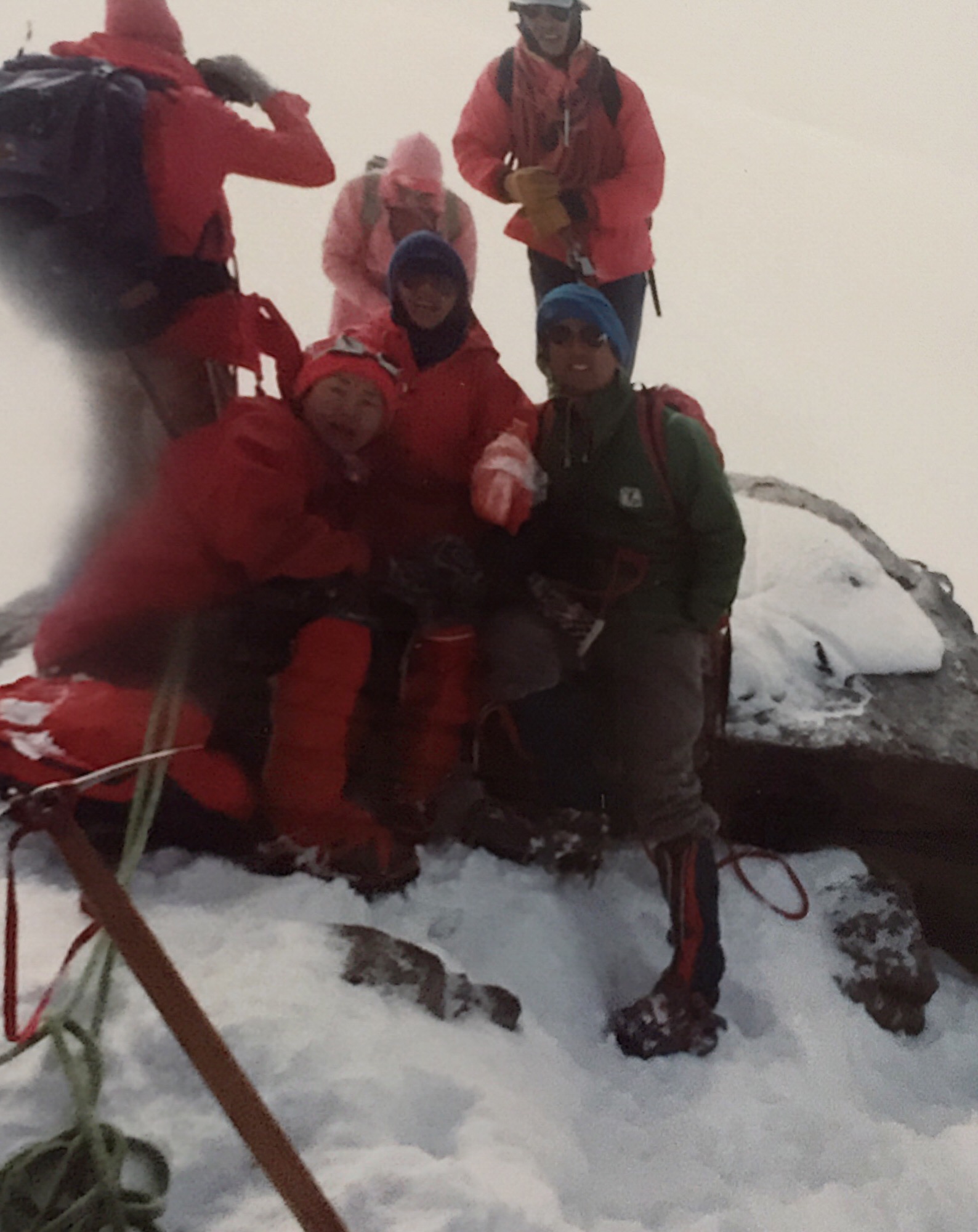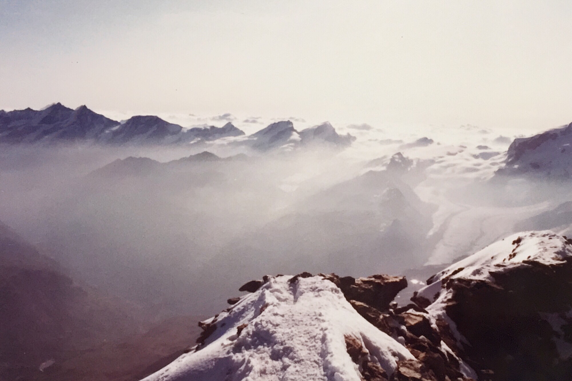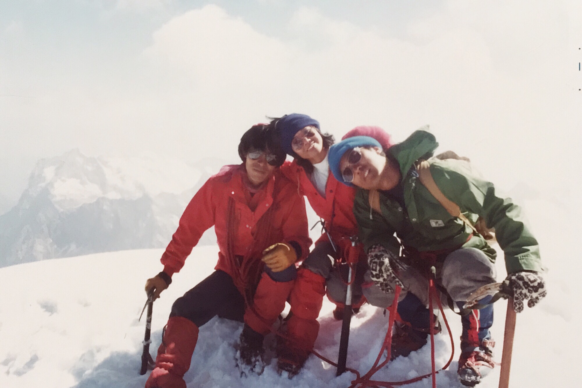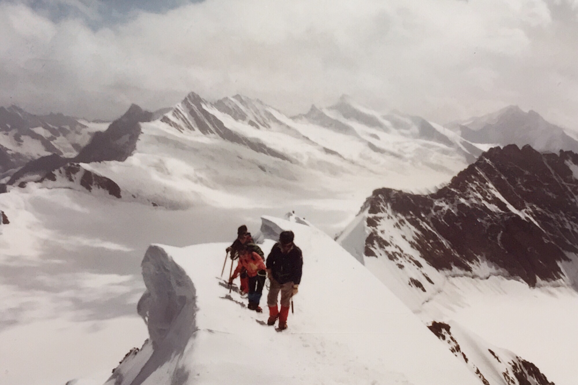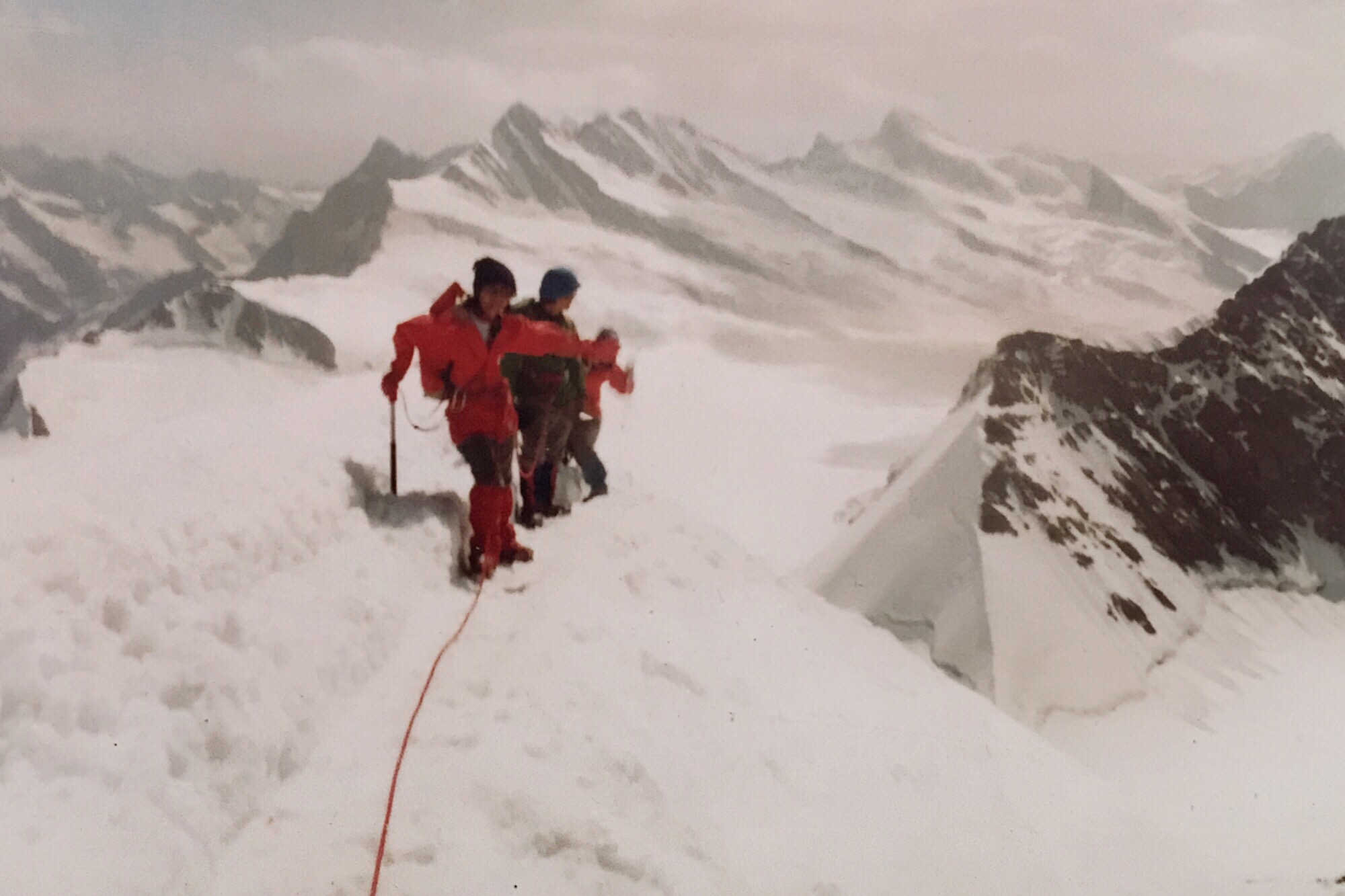 山頂へ近づくほど風は強まり、足元の雪稜は鋭く細くなっていった。ロープで繋がれた三人の足取りは慎重そのものだったが、振り返ると果てしなく広がる雪原と、雲海の向こうに浮かぶ無数の峰々が見え、その美しさに胸を打たれた。山頂の十字架が現れたときの感動は、言葉にしがたい。夫婦でしっかりと立ち、ガイドにカメラを渡して記念写真を撮ってもらったあの瞬間、モンブランでの悔しさが少し溶けていくような気がした。